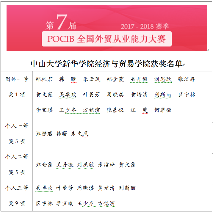 2017年11月28日,历时20天的全国老员工外贸从业能力大赛(简称:POCIB大赛)秋季赛终于落下了帷幕。由公司2015级国际经济与贸易专业的20名同学组成的中山大学新华学院参赛队伍一举斩获本次比赛的团体一等奖以及17项个人奖项,其中3人获得个人一等奖,5人获得个人二等奖,9人获得个人三等奖。